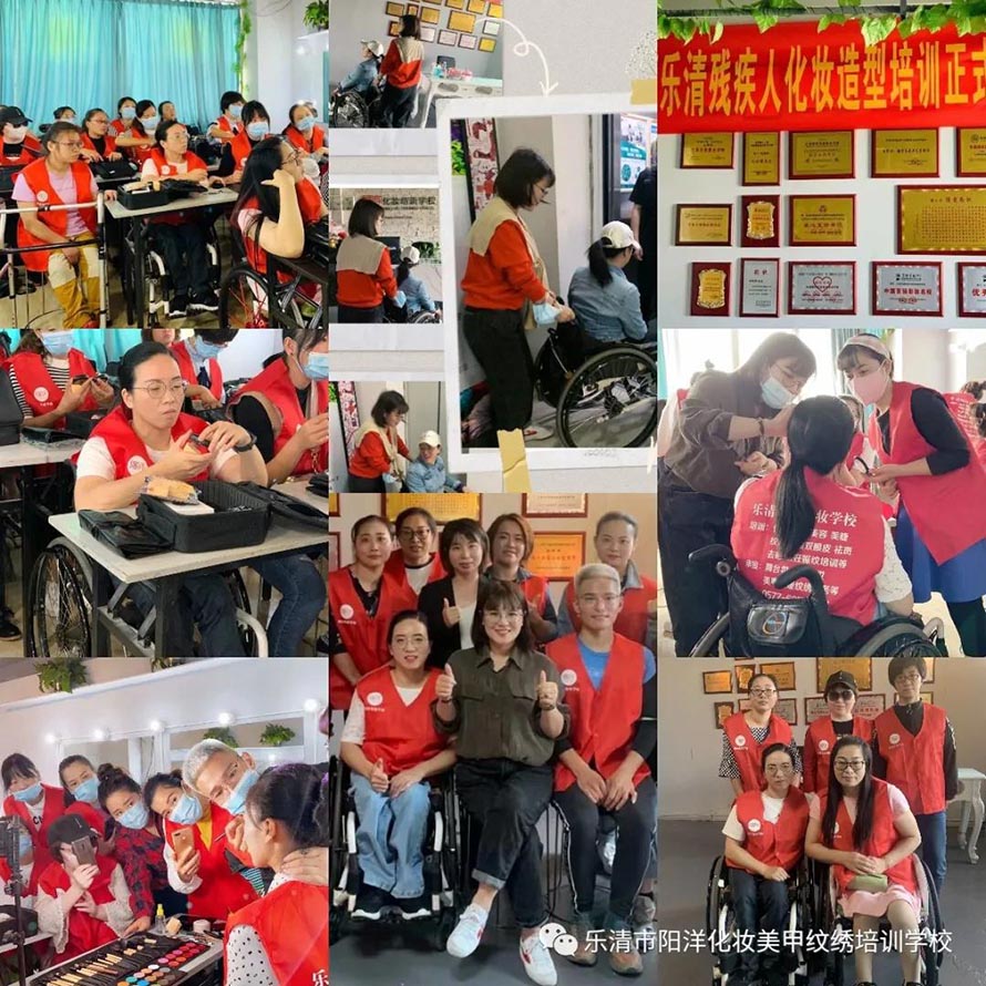 陽洋化妝學校開辦至今,常年致力于公益事業活動。學校為社會進行公益化妝進行行動,特殊人群與孤兒聾啞人全部免費學習課程。美麗他人,成就自己。授人以魚不如授人以漁,傳授他人安身立命的一技之長,這才是真正地幫助她們,立足于社會。 今年有一位來自樂清大荊的17歲獨掌少年,本來他的父親讓他去學習理發,他爸爸說一只手拿剪刀、另一只用皮筋套住假手去學習理發、期初他爸爸是這樣想的、我們的校長楊老師跟他父親說、美發用假手應該不是很方便、就推薦他學習化妝、并且是免費學習、自己不用出學費、自此他來到陽洋職業技能學校,開始他的學習之路。