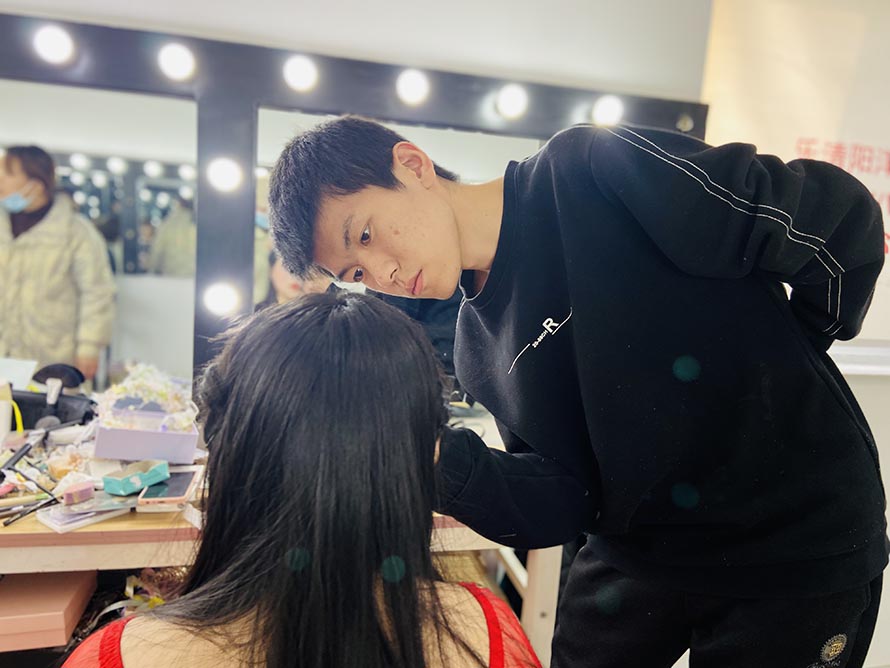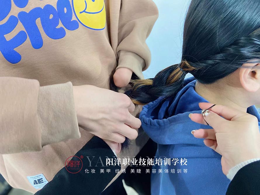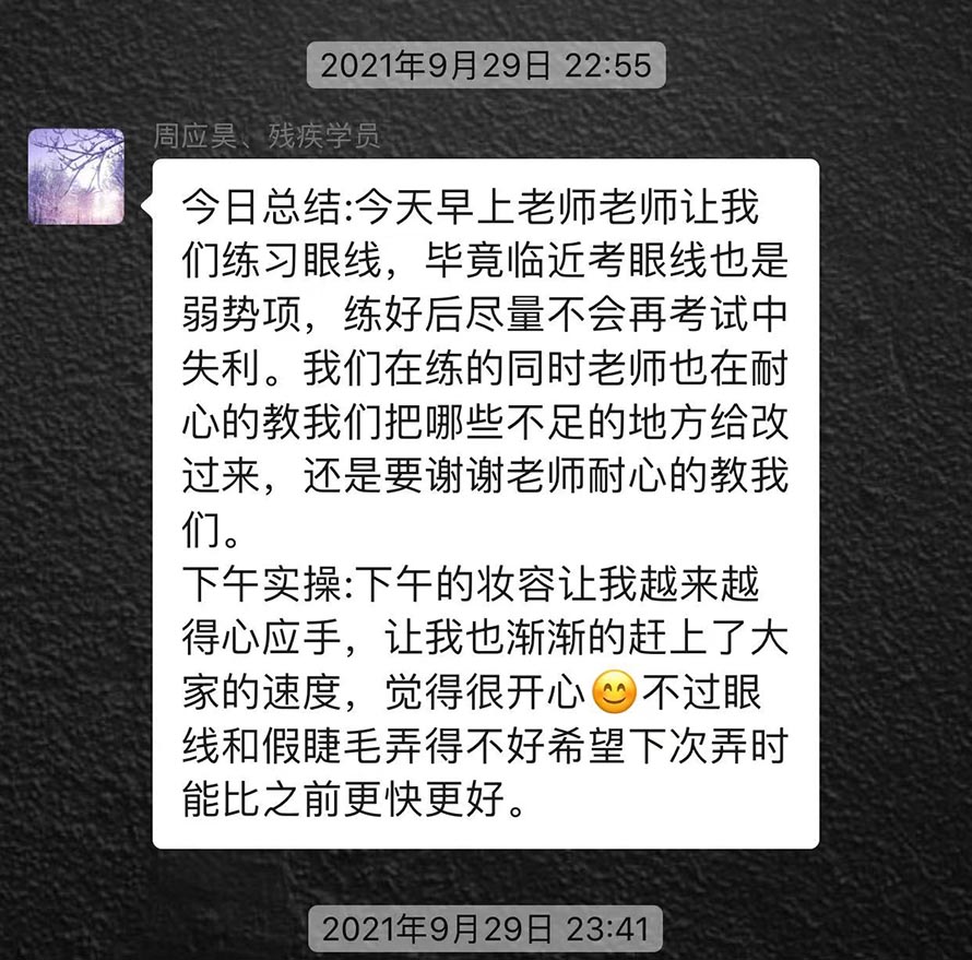 我們學校對孤兒殘疾人是免費學習。他來陽洋學習了四個月的國際化妝班,全程免費學習。他非常努力,每天回家也按時完成老師的家庭作業、第二天作業拿來老師檢查、課堂上老師一對一輔導做發型。陽洋的老師對待每一個學員都是很負責