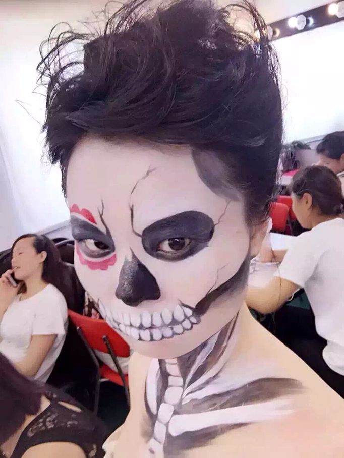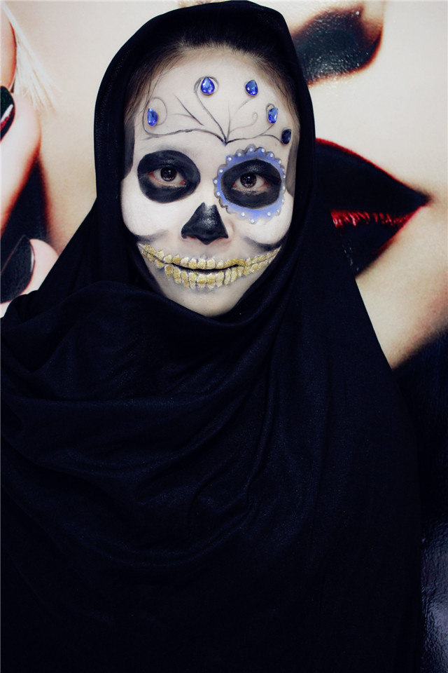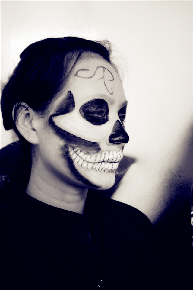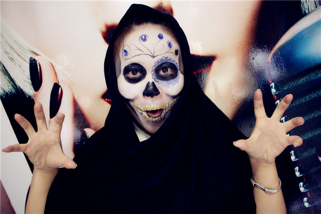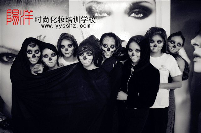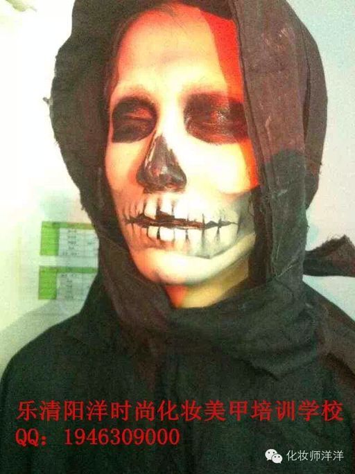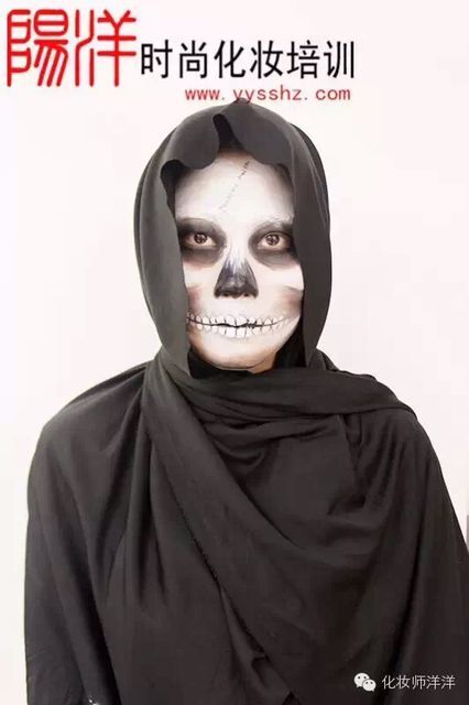 樂清陽洋時尚化妝美甲學校 中國頂尖—形象設計化妝美甲職業培訓 今天陽洋時尚化妝美甲學校的課堂給大家呈現的是一個骷髏妝,妝型以黑色的骷髏配上黑色的披風,這樣一個妝型的形成呈現出來之后,觀眾們就發現這樣精彩的妝型,原來是那么簡單和迅速。現在就讓我們跟著化妝師的筆刷來看看這個造型的形成