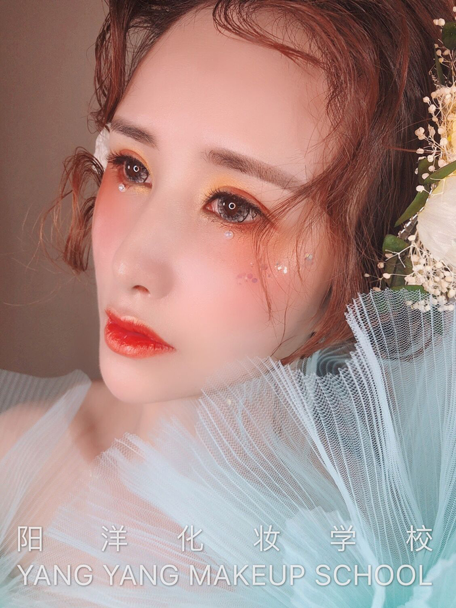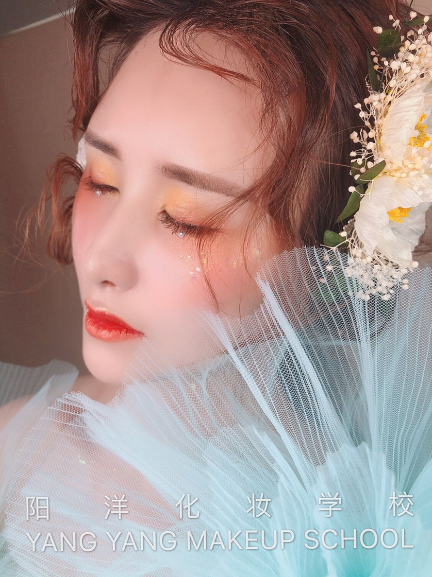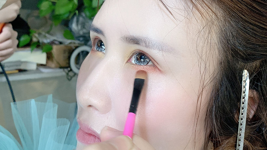 下眼影也不要忘記哦,畫下眼影的時候要讓新娘眼睛向上方看,采用相同對應的眼影,自然的暈開,注意眼影的取量,一定要少量多次哦。