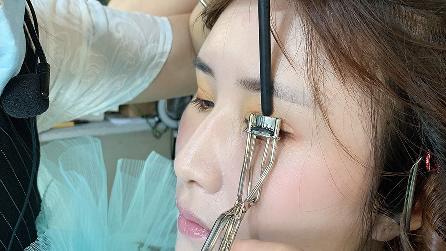 眼線完成后,再夾翹睫毛,提起眼皮夾睫毛。角度由底到高,按照根部,中間,尾部順序夾睫毛。