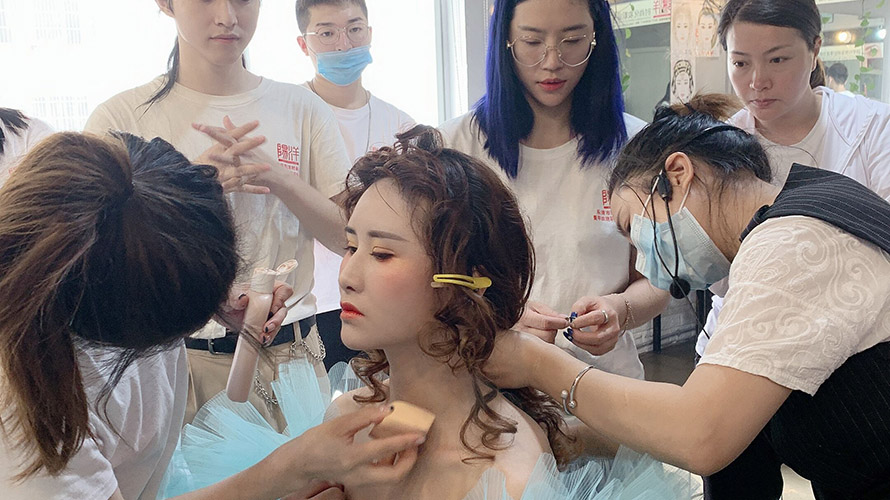 第三步:皮膚質感處理,粉撲按壓涂抹內輪廓,完美皮膚狀態。注意耳朵與脖子的色澤銜接。脖子,身體用美白霜銜接CCTV區液體高光棒提亮。液體高光棒親膚性強,粉撲快速推開。
