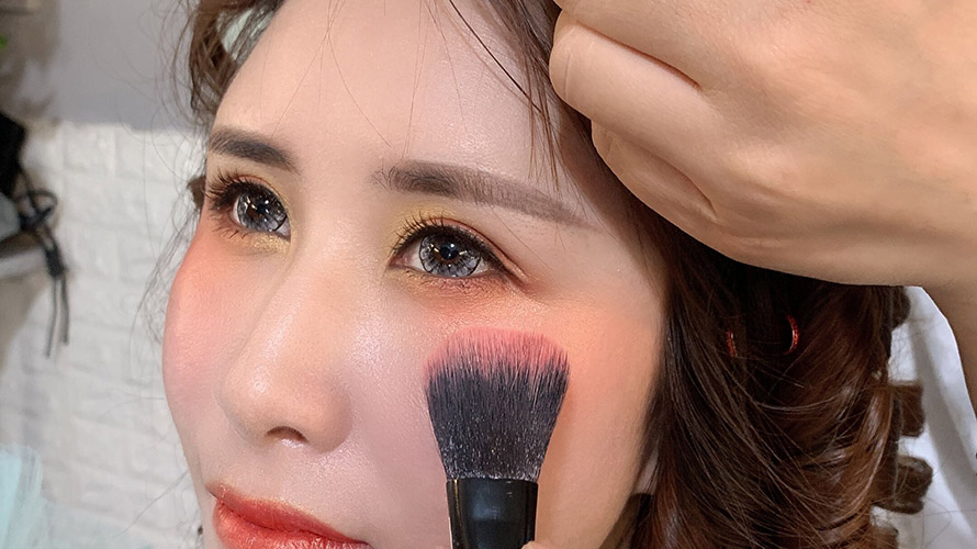 妝面的最后一個步驟,涂抹液體腮紅,液體親膚力強,底妝更輕薄,但需注意液體腮紅用量,用手指在笑肌上方上妝,推開腮紅邊緣。加深腮紅中間顏色,臉頰兩邊同時上腮紅, 高光提亮腮紅邊緣。