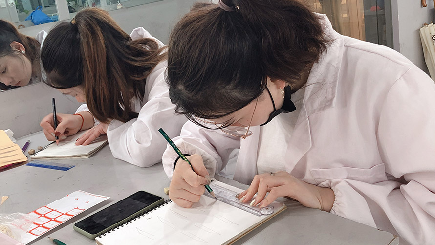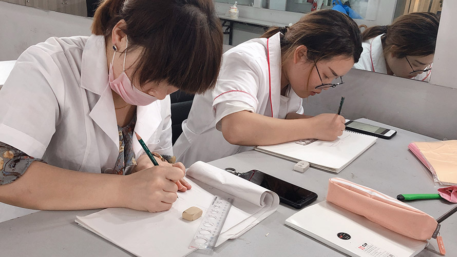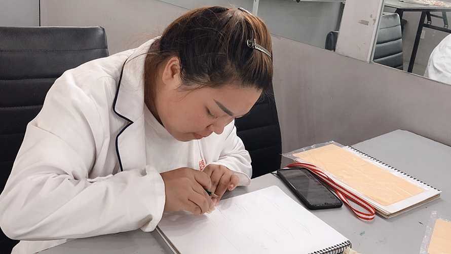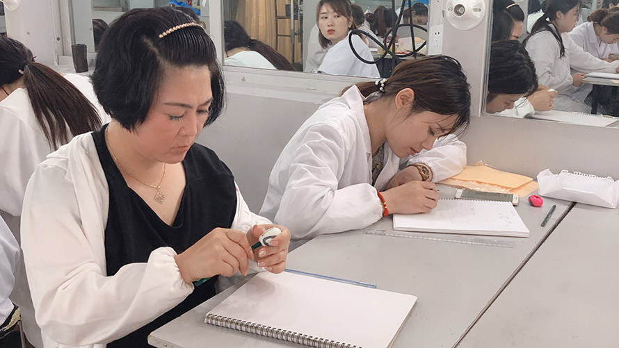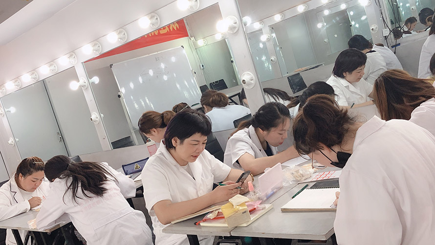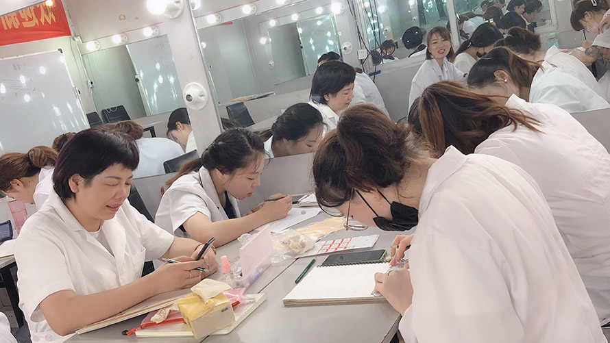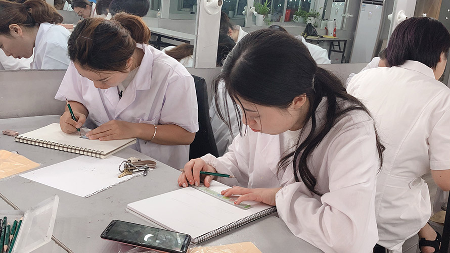 來學習的學員都是0基礎的學員,老師先教他們在本子上畫型,本子上畫型會后老師在教她們在皮上練習眉型,皮上練習好后再到真人臉上做真人實操,之所以陽洋學校學員都學的很棒,是因為基礎打的牢固。