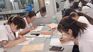 來學習的學員都是0基礎的學員,老師先教他們在本子上畫型,本子上畫型會后老師在教她們在皮上練習眉型,皮上練習好后再到真人臉上做真人實操,之所以陽洋學校學員都學的很棒,是因為基礎打的牢固。