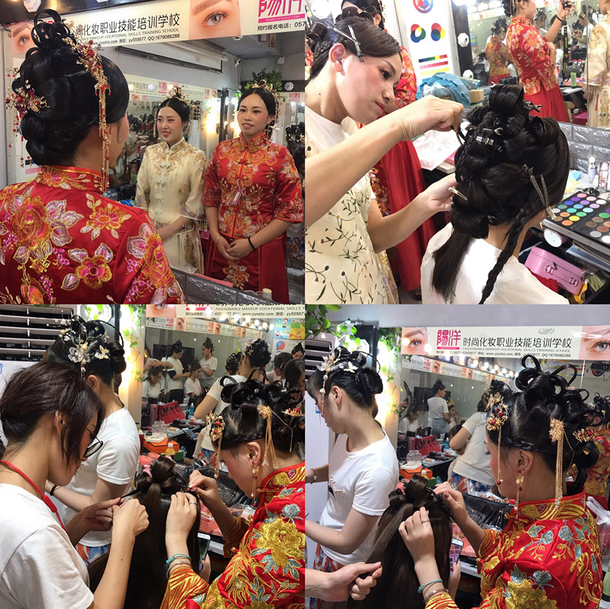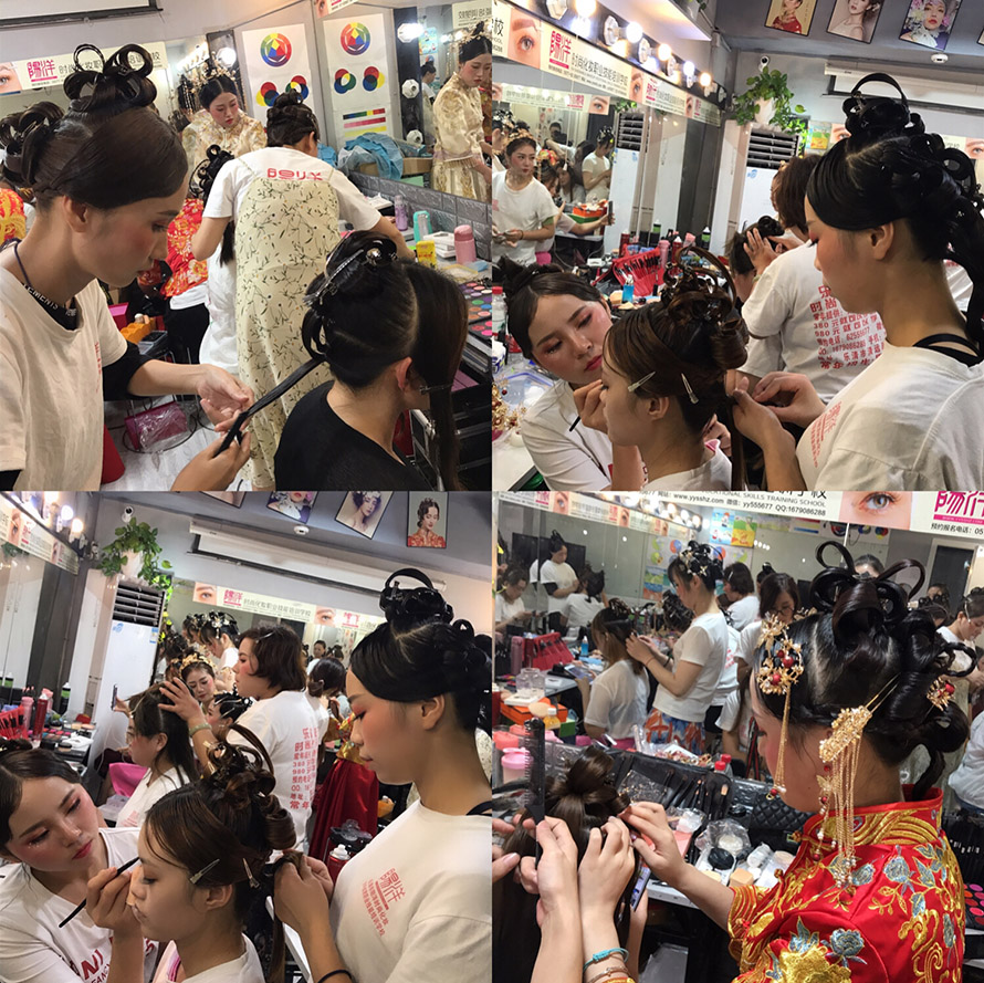 同學之間相互對練妝容造型,將前面兩個月學習的妝容與發型在整體造型中都靈活運用起來