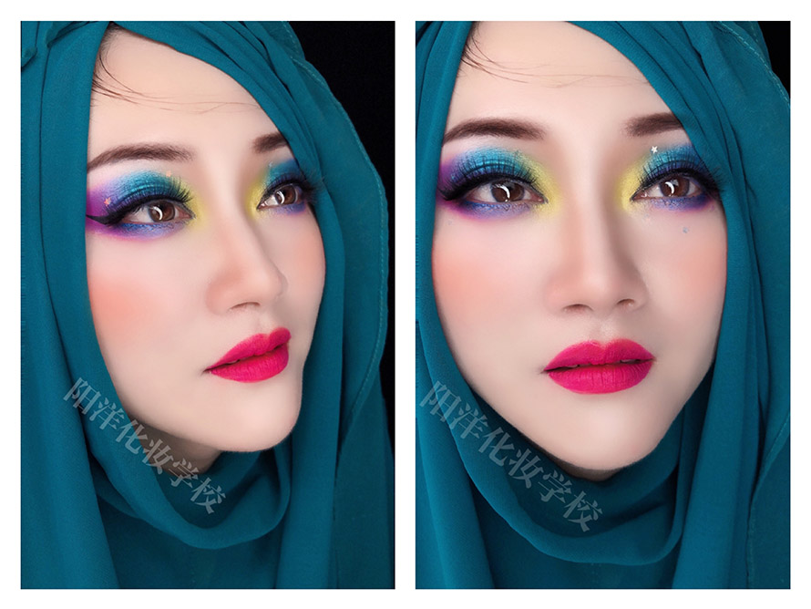 色彩呈現(xiàn)強(qiáng)烈耀目的視覺(jué)沖擊力,冷暖色對(duì)比色明暗色。整體妝容和諧相呼應(yīng),