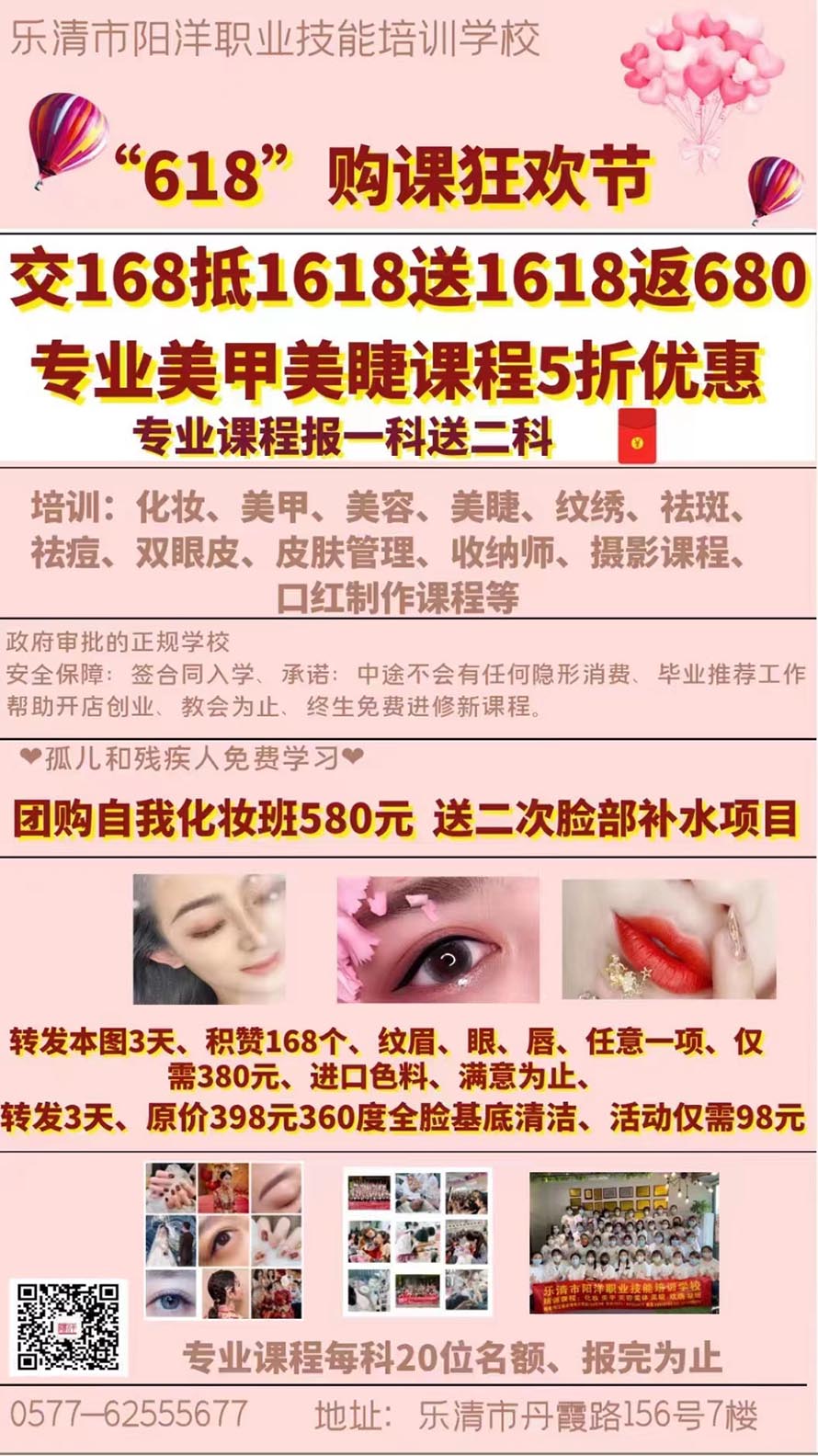 當前位置:樂清市陽洋職業技能培訓學校 » 優惠資訊618活動 樂清哪里有學化妝發布時間:2022-6-9 12:22:15 瀏覽次數:1961 |