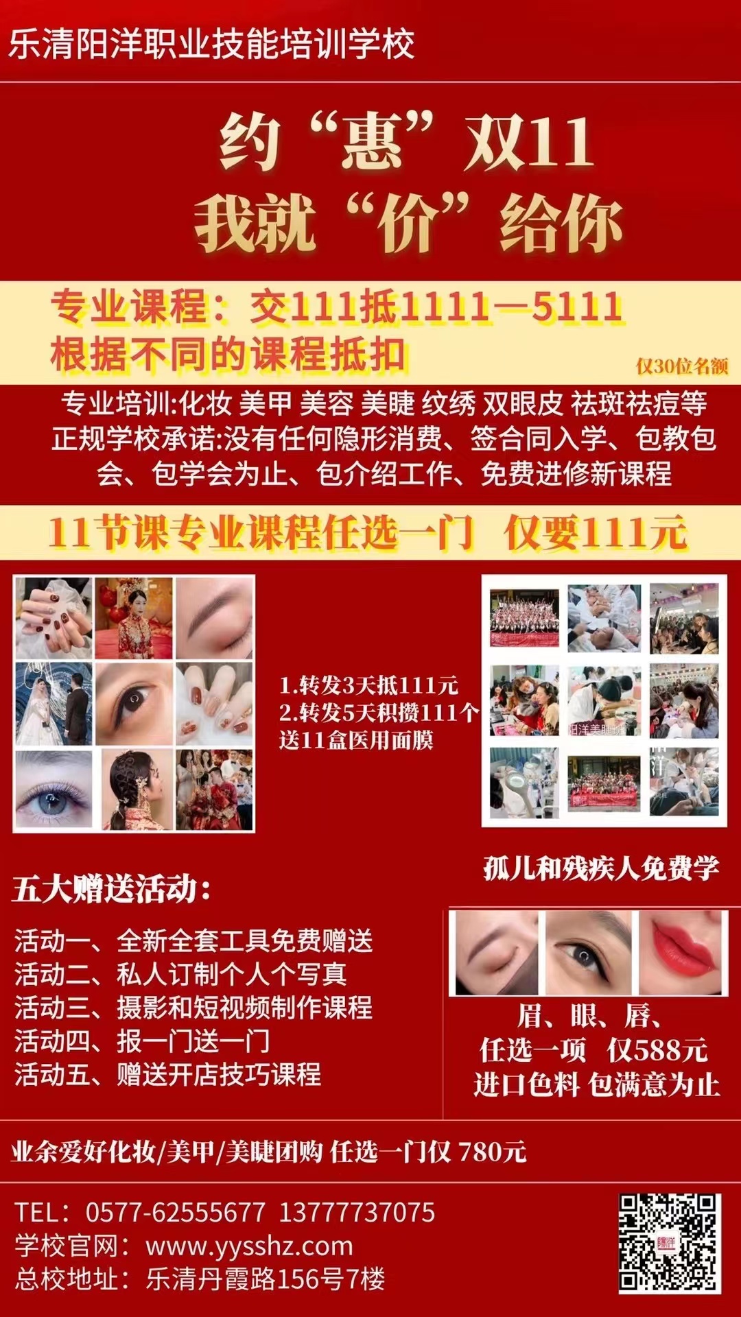 當前位置:樂清市陽洋職業技能培訓學校 » 優惠資訊雙11活動正式開啟 #樂清哪里有學化妝發布時間:2023-10-31 18:40:01 瀏覽次數:1988 |