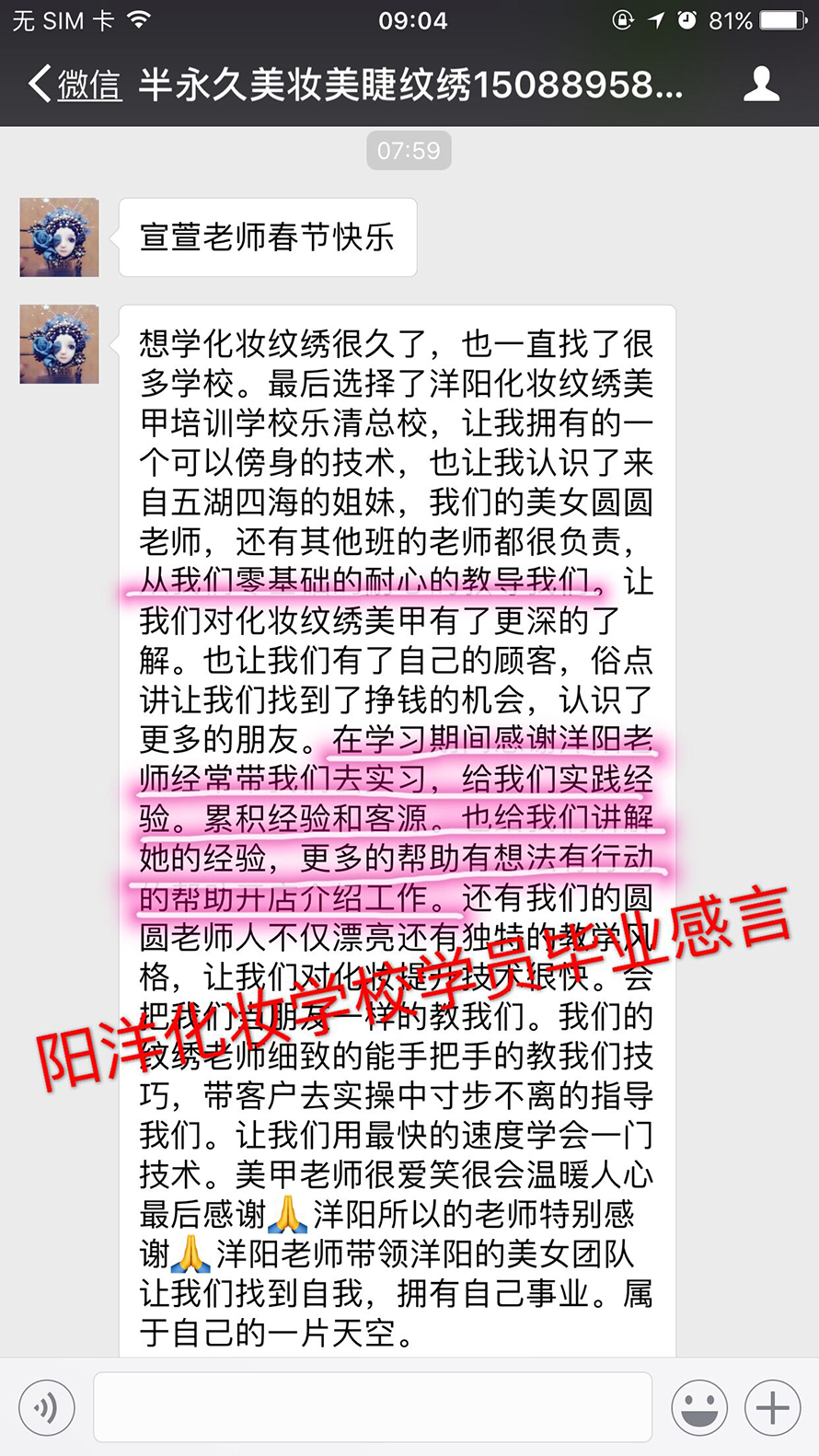 讓我們對化妝紋繡美甲有了更深的了解。也讓我們有了自己的顧客,俗點講讓我們找到了掙錢的機會,認識了更多的朋友。在學(xué)習(xí)期間感謝洋陽老師經(jīng)常帶我們?nèi)嵙?xí),給我們實踐經(jīng)驗。累積經(jīng)驗和客源。也給我們講解她的經(jīng)驗,更多的幫助有想法有行動的幫助開店介紹工作。還有我們的圓圓老師人不僅漂亮還有獨特的教學(xué)風(fēng)格,讓我們對化妝提升技術(shù)很快。會把我們當朋友一樣的教我們。我們的紋繡老師細致的能手把手的教我們技巧,帶客戶去實操中寸步不離的指導(dǎo)我們。讓我們用最快的速度學(xué)會一門技術(shù)。