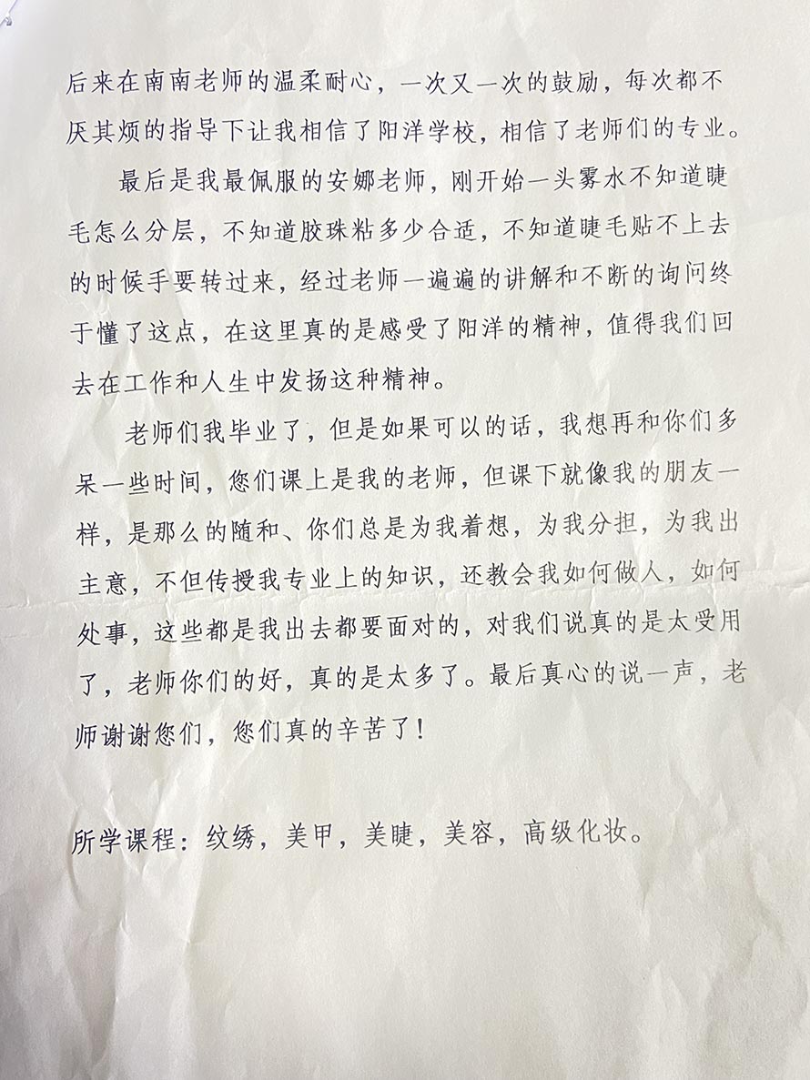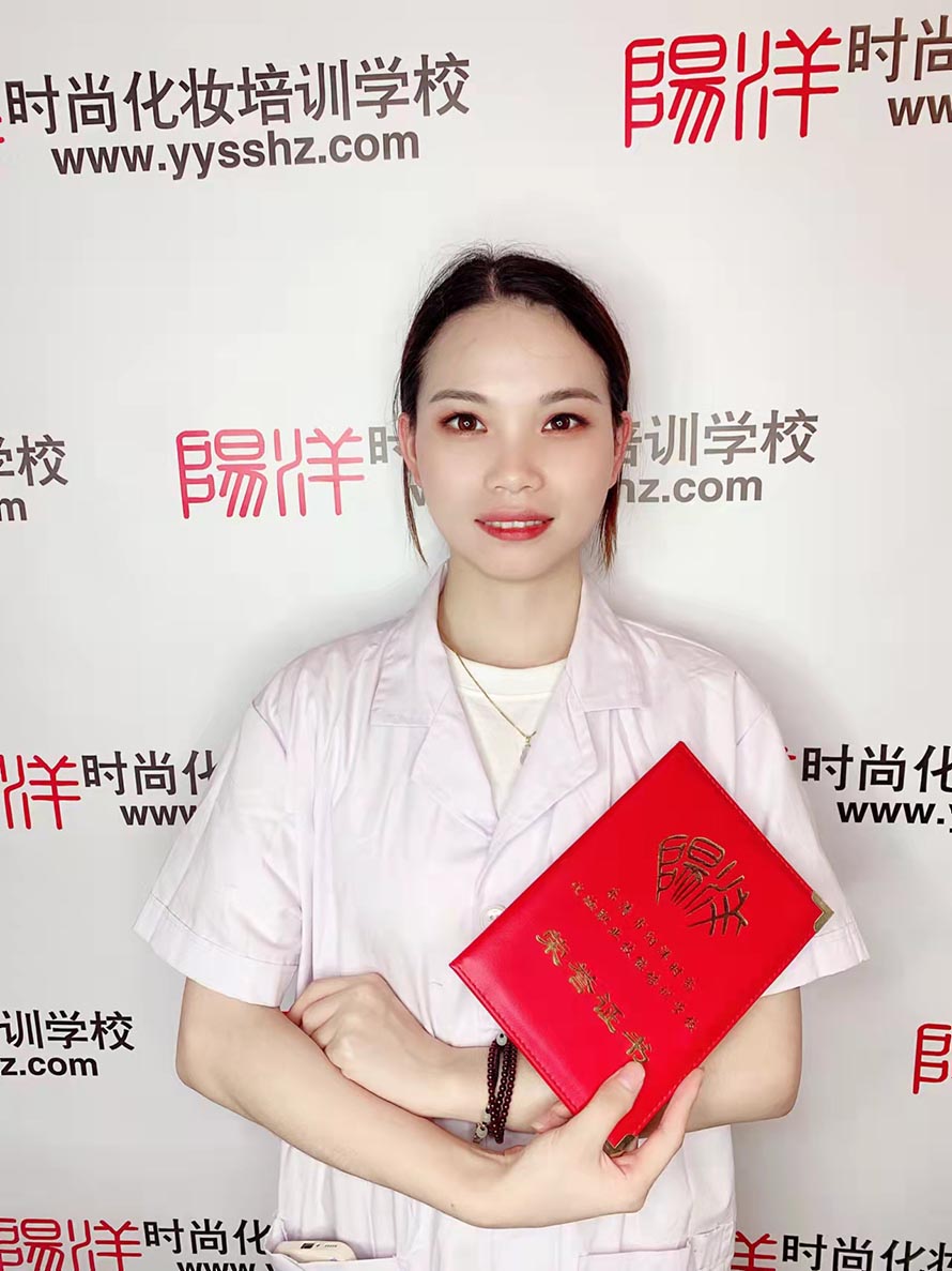 在聽說樂清市只有我們陽洋化妝職業技能培訓學校是正規的化妝學校以后, 果斷選擇了來陽洋學習技術,她是比較有目標有規劃的,但同時也比較保守, 先選擇學習了一門課程,通過我們專業老師的耐心指導,一對一手把手教學以后, 她感覺自己深深的感動了,所以有選擇學習了其他課程,成為全能型的美業人才!