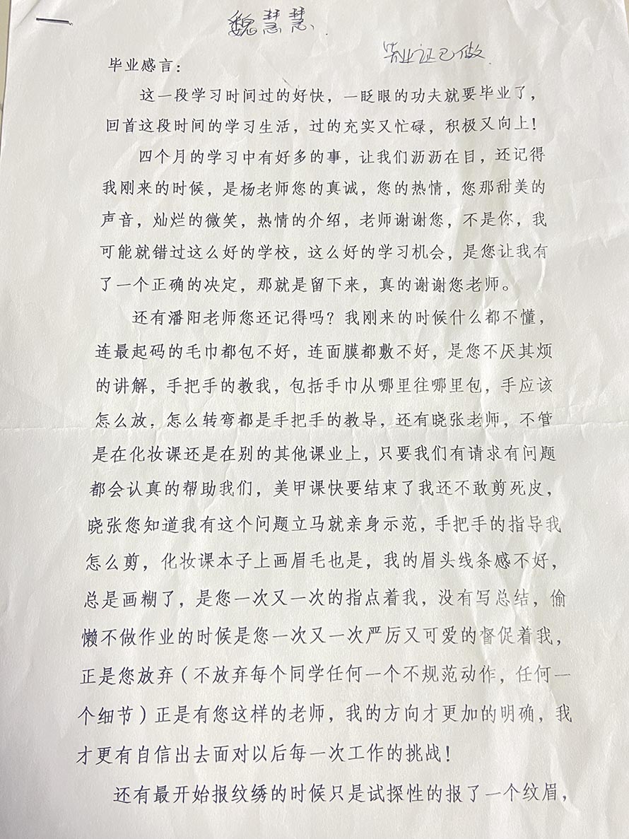 陽洋化妝職業技能培訓學校恭喜魏慧慧同學順利畢業,成為全能美業人才! 慧慧同學在學校學習期間非常的用心和刻苦,在課上老師教學的過程中每每都是非常認真地, 課下還經常自己練習技術,對于學習技術她真的是非常的努力。