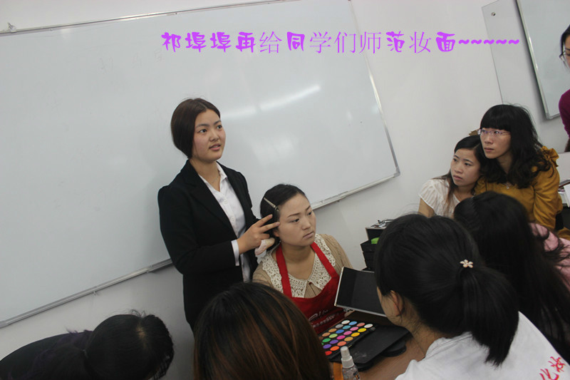 一一給同學們解答她的經驗~還快速化出簡單的生活妝~同學們問她化妝時間要多長!她說慢的20分鐘!快的10來分鐘!…對在校的學生來說很不可思議!因為這些同學都是剛學不久!練妝都要1個來小時!我相信同學們畢業后也有埠埠這么棒。