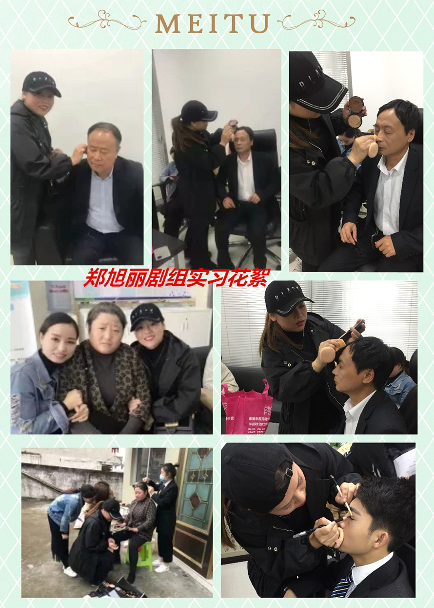張正花,王曦,晏蓮霜同學給演員化妝合影花絮, 學校都會經常給學生安排提供大量的實習機會,不管是舞臺妝還是影視妝,新娘妝,各種T臺秀妝容等,學校都會經常安排學生出去實習,實操為主理論為輔的學習方式。