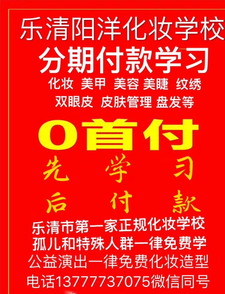 陽洋化妝美甲紋繡技能培訓學校 七大專業王牌課程,化妝,發型,紋繡,雙眼 皮,美甲美睫美容。火熱報名中...... 可分期付款,0首付,學習沒壓力 總校報名熱線:0577-62555677;13777737075 微信:yysshz0188 QQ:1679086288;3193458088 總校地址:樂清市清遠路60號4樓-6樓 學校網址:www.vporeve.com 柳市分校報名熱線:0577-62556767 13777737075 微信:lsyyhz55 地址:柳市鎮柳江北路1號 四樓聯盈辦公家具專賣樓上(夏威夷大酒店對面 中國銀行旁邊) 學校網址:www.vporeve.com