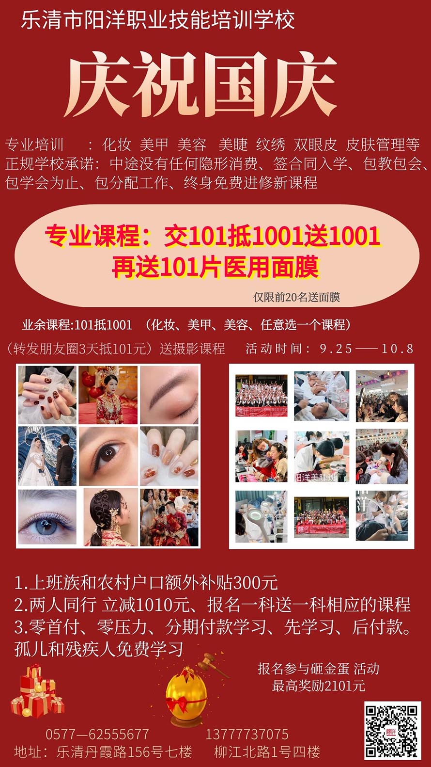 當前位置:樂清市陽洋職業技能培訓學校 » 學校新聞陽洋2021國慶活動火爆來襲#溫州樂清柳市虹橋哪里有學化妝美甲紋繡美睫美容?發布時間:2021-9-26 9:52:36 瀏覽次數:1953 |