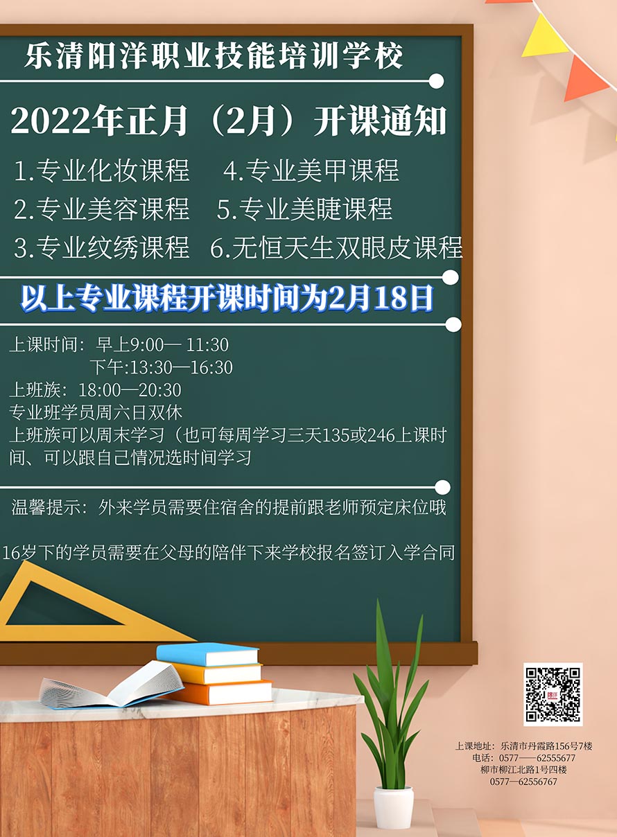 當前位置:樂清市陽洋職業技能培訓學校 » 學校新聞2022年陽洋化妝學校 正月開班時間表發布時間:2022-1-5 10:40:31 瀏覽次數:1963 |