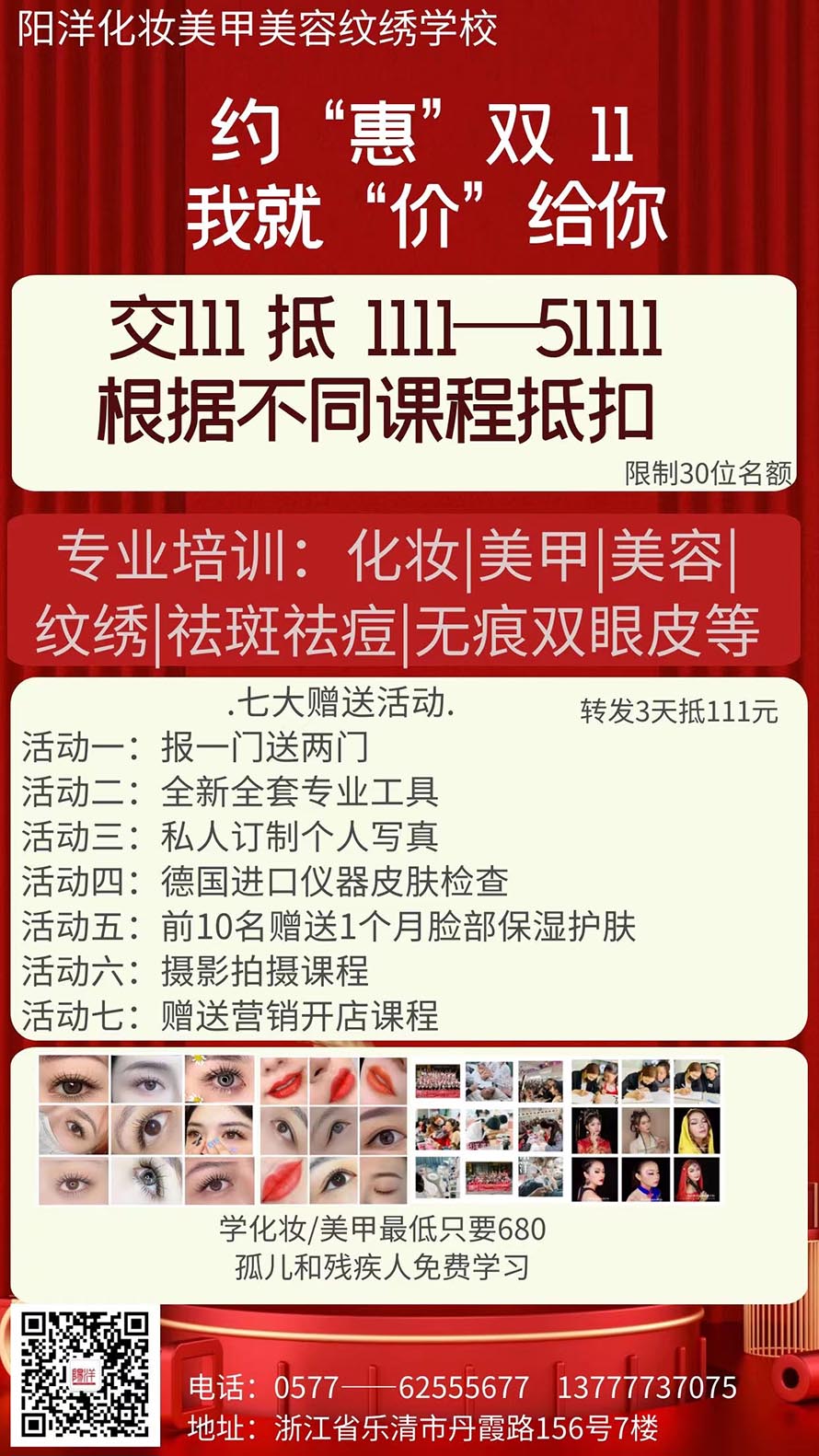 當前位置:樂清市陽洋職業技能培訓學校 » 學校新聞樂清哪里有學化妝?陽洋化妝學校雙十一活動火熱來襲!交111抵1111到5111元發布時間:2022-10-27 14:06:33 瀏覽次數:1951 |