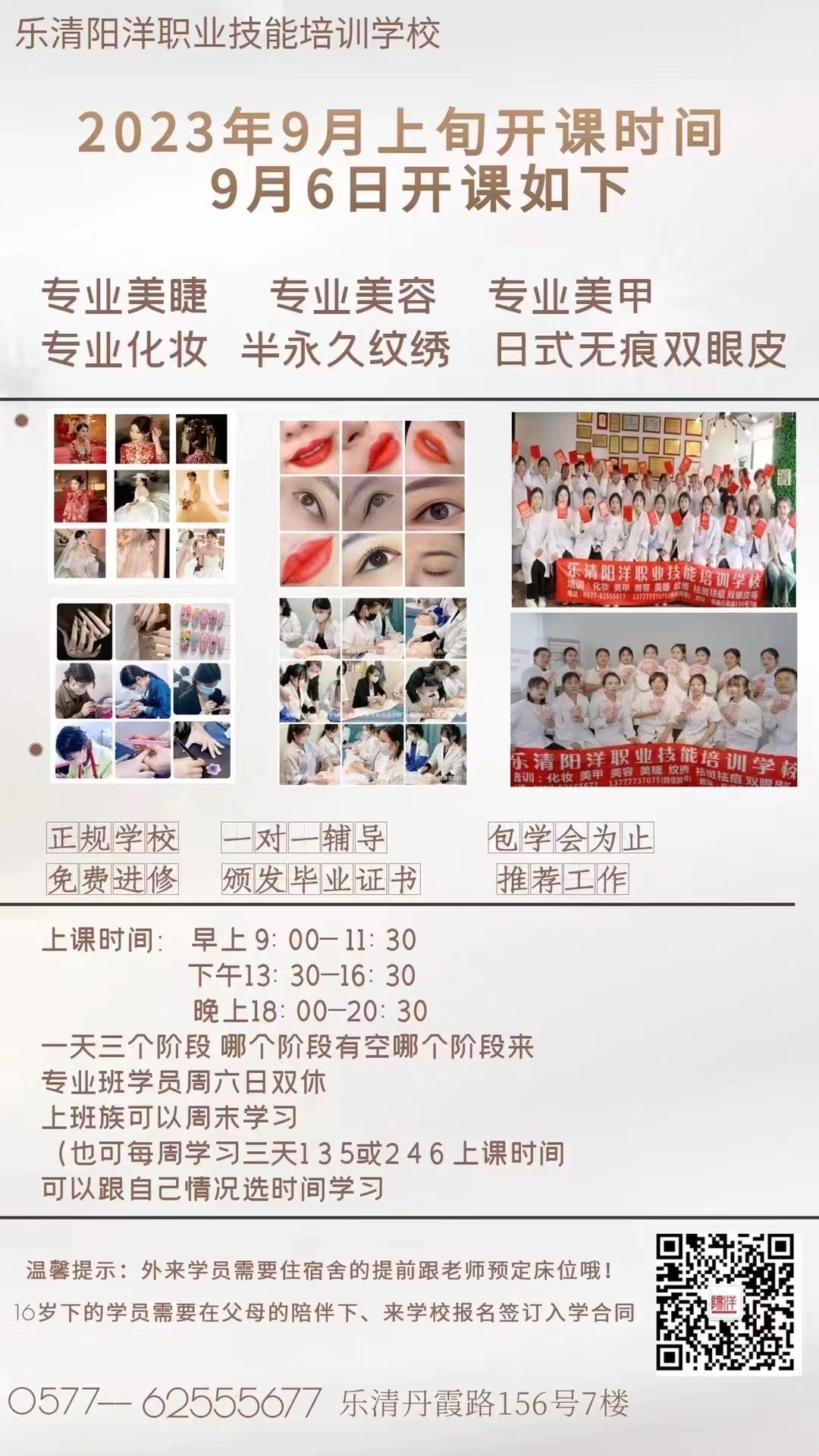 九月新班開課時間通知,九月六號新班正式開課,需要住宿舍的同學一定要提前預定哦。來陽洋化妝培訓學校學習,白天有空白天學,晚上有空晚上學,把空余時間利用起來。讓自己學會一門技能 |