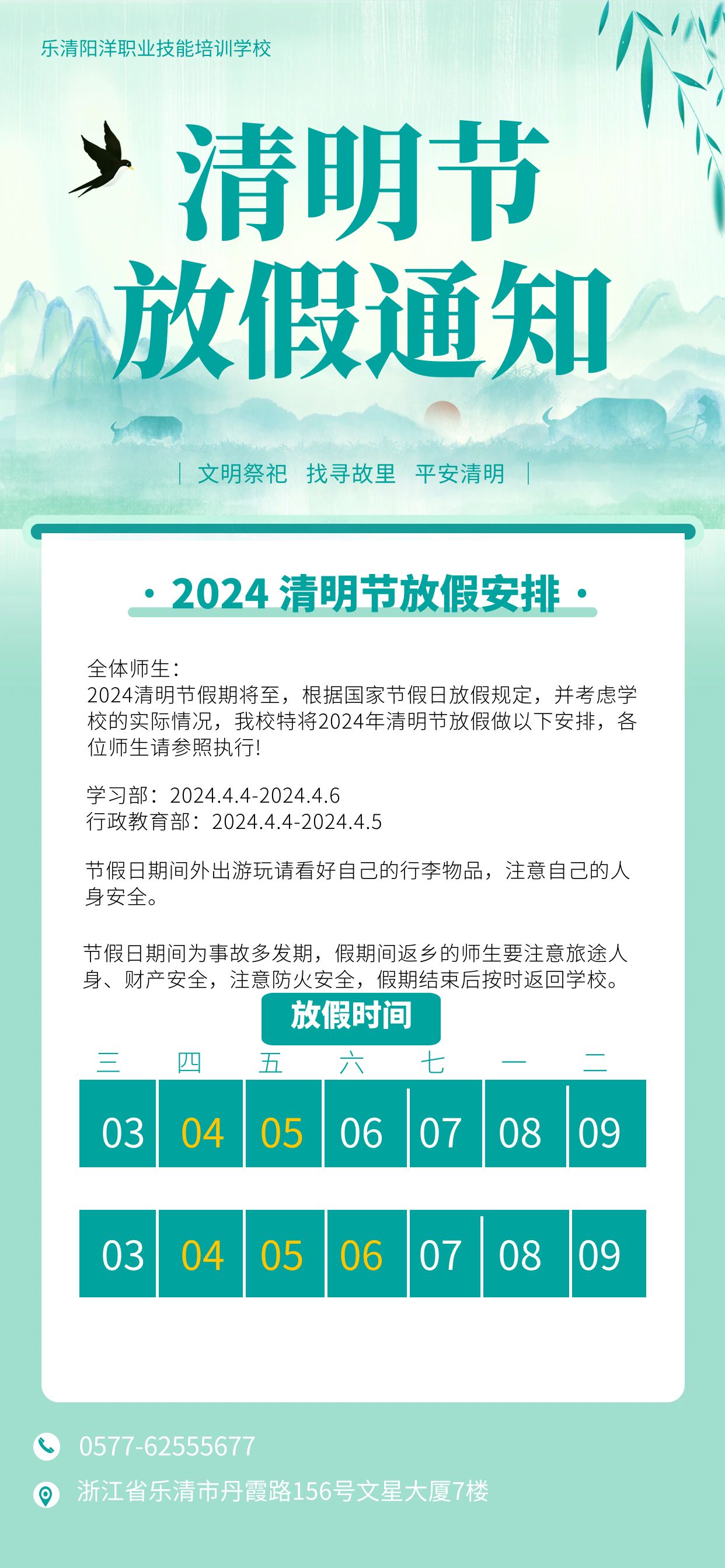 當前位置:樂清市陽洋職業技能培訓學校 » 學校新聞清明放假通知發布時間:2024-4-2 9:06:25 瀏覽次數:1953 |