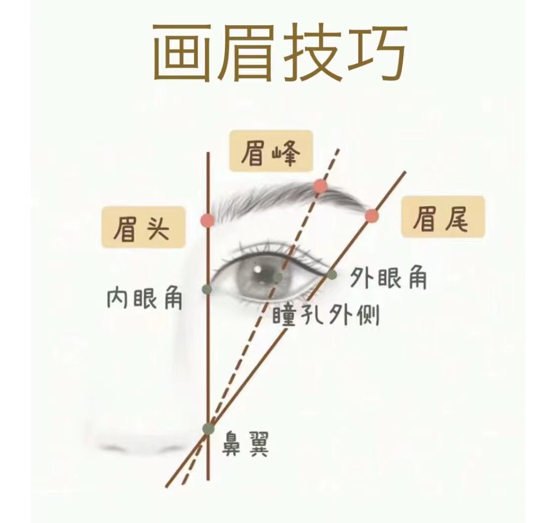 眉頭的位置:鼻翼和內眼角的垂直延長線上 眉峰的位置:鼻翼和瞳孔外側的延長線上 眉尾的位置:鼻翼和外眼角的延長線上