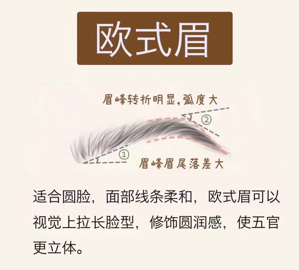 畫法技巧: 眉峰適當后移,拉長眉尾,可以拉寬額頭比歐式眉轉折弧度更柔和,更適合亞洲人眉腰上揚角度①約30°,眉尾下落角②約40° 眉毛不宜太粗,防止上面部量感太重 ![]()