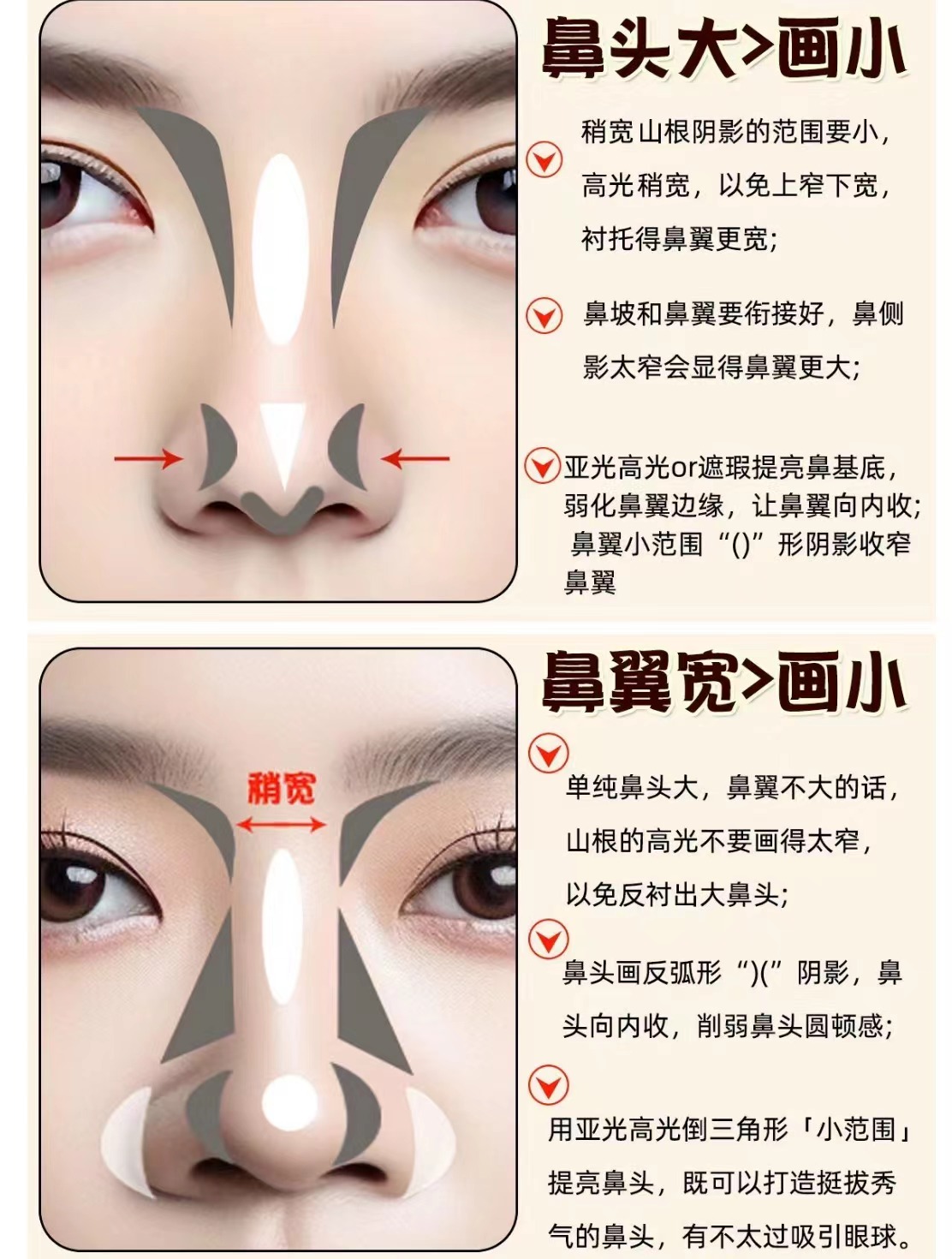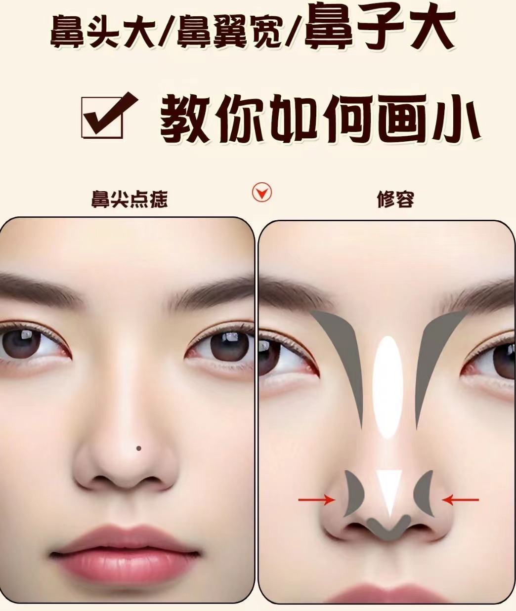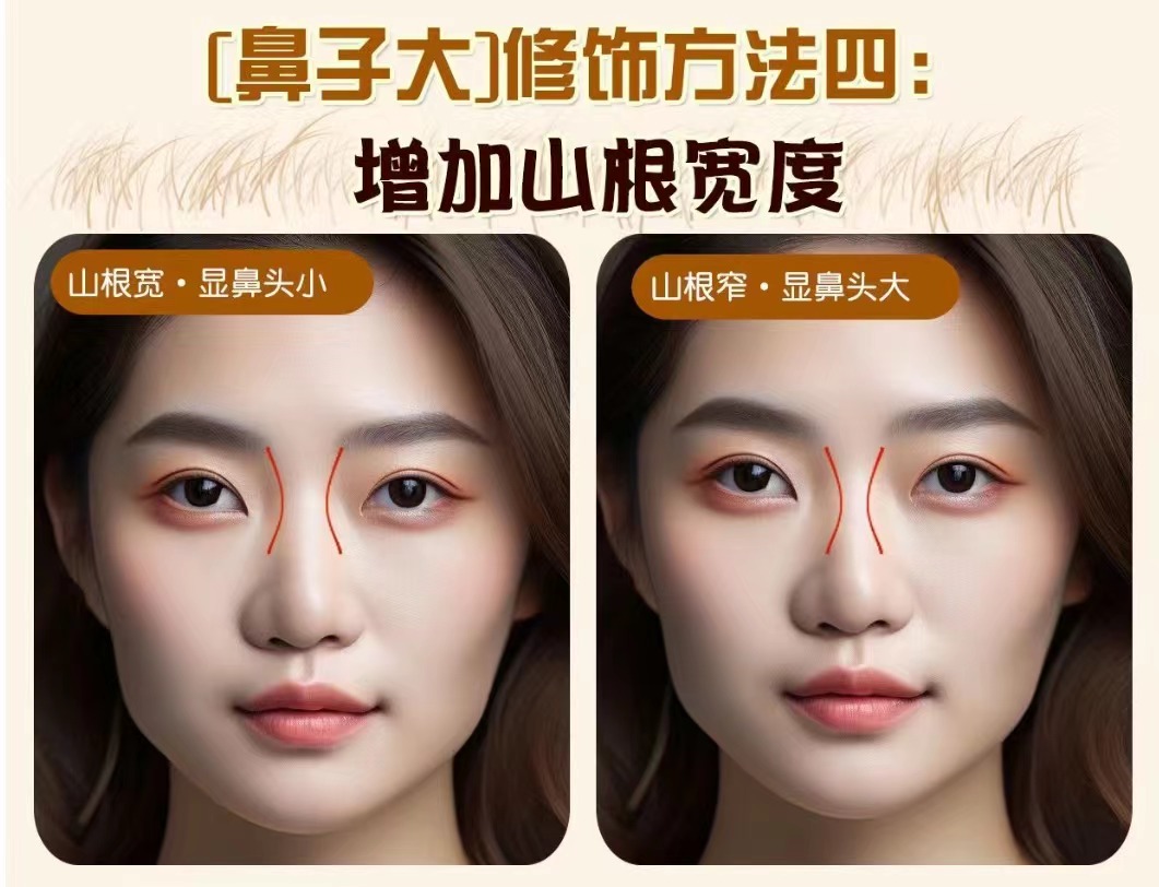 原理: 山根&鼻翼的寬度也會形成對比山根太細也會反襯鼻翼大 操作方法: 鼻子寬的人可以根據鼻翼的寬度適當增加山根寬度 ![]()