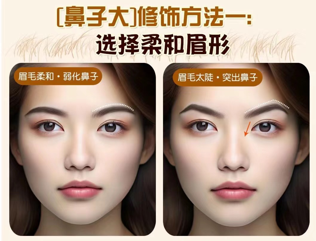 原理: 太陡的眉毛會牽引視線,會讓人順著眉毛的走向關注到鼻頭。 眉毛犀利的線條也會突出鼻子的圓潤感。 操作方法: 柔和的眉形會減弱這種牽引感 適合眉形: 標準眉、彎月眉 (但也要考慮臉型的去選擇適合的彎眉類型) ![]()