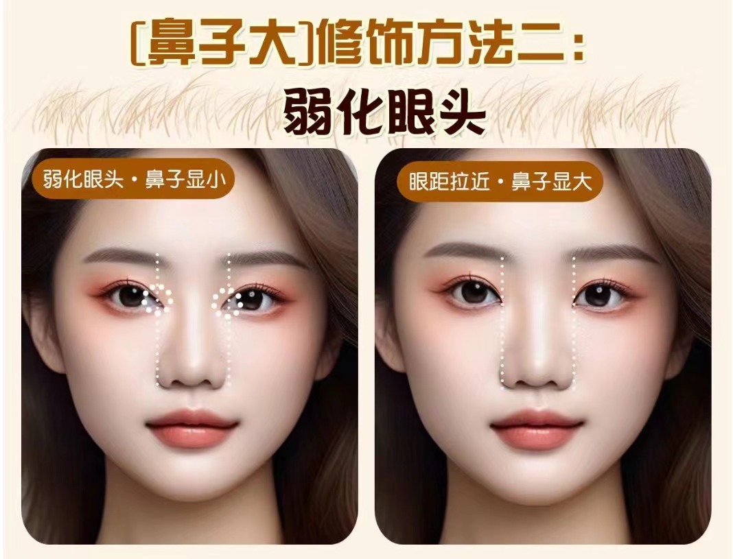 原理: 眼距拉近后會反襯鼻子的寬度,眼距的寬度和鼻翼的寬度會形成一個對比,兩者之間的差距越大,顯得鼻子就越大。 操作方法: x不要開內眼角眼線 √弱化內眼角,眼妝重點放在眼尾, 眼影可以選擇后移方式 ![]()
