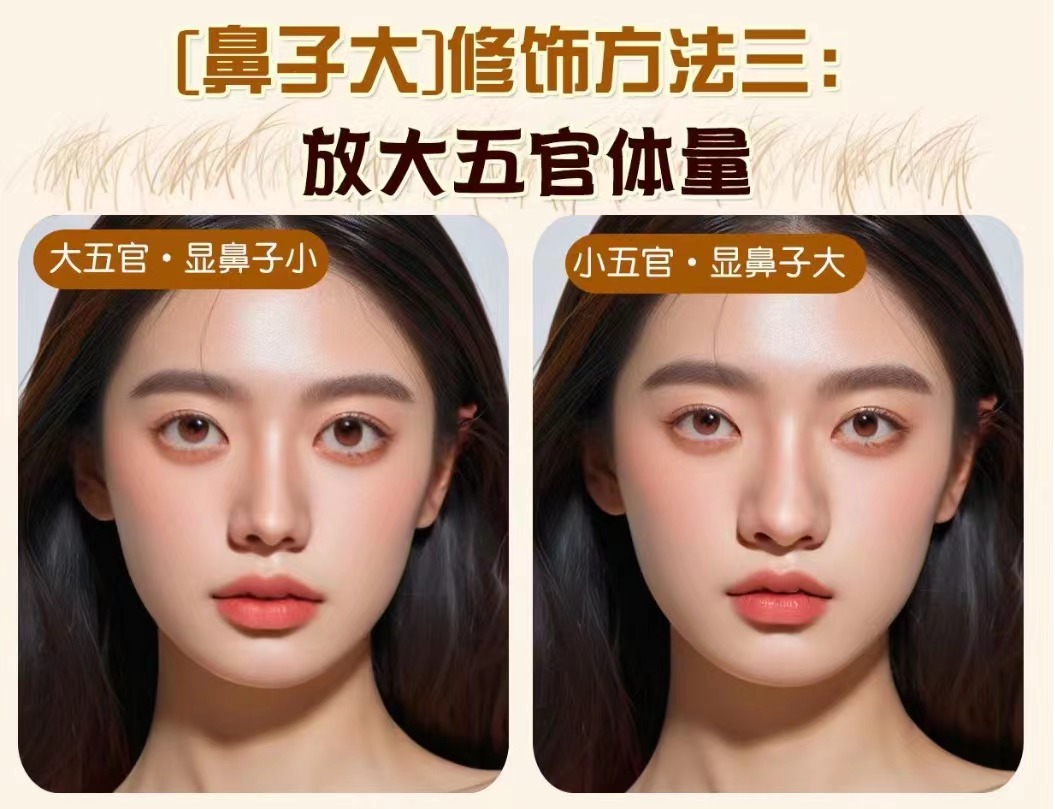 鼻子的修飾并不是單一的對鼻子這一處進行修飾,可以通過改變面部其他地方來達到修飾鼻子的效果