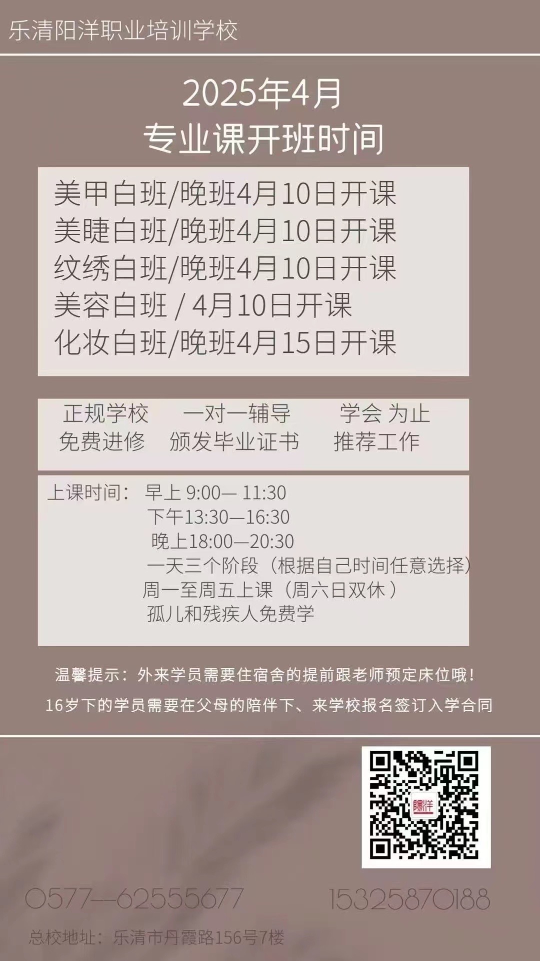 樂清陽洋4月開課信息時間—樂清哪里有學化妝|樂清化妝學校|樂清美甲學校發布時間:2025-3-31 8:43:42 瀏覽次數:1979 |