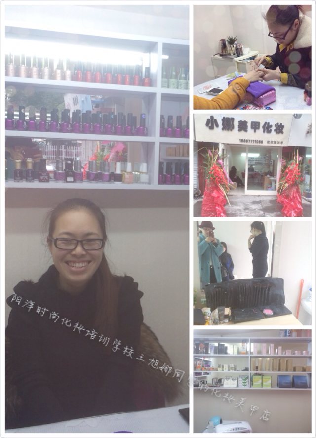 2013年11月17日畢業(yè)于樂清陽洋時尚化妝美甲培訓學校學生!王旭娜同學開的一家屬于自己的化妝美甲店!2014年1月8日開業(yè)!祝愿小娜化妝美甲店生意興隆!一分付出十分收入!旭娜加油!!!