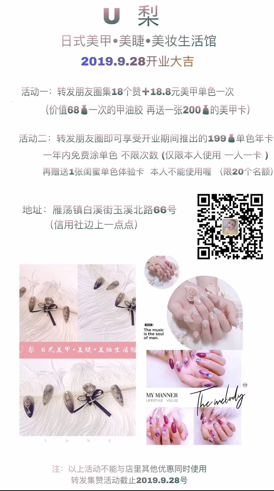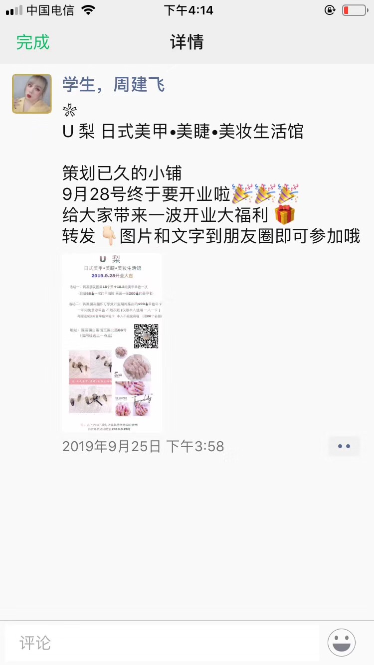 2019年來自雁蕩的周建飛同學 3月份來校報名學習,8月份畢業于陽洋化妝學校 在校學習了國際化妝大師班+美甲創業班+高級美睫班+紋繡精英班 八月份畢業,九月份就開始自己的創業之旅 在雁蕩當地開了屬于自己的“U梨”工作室