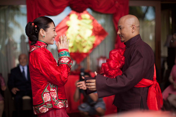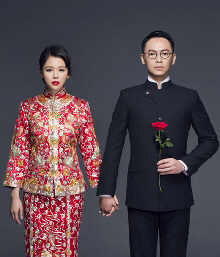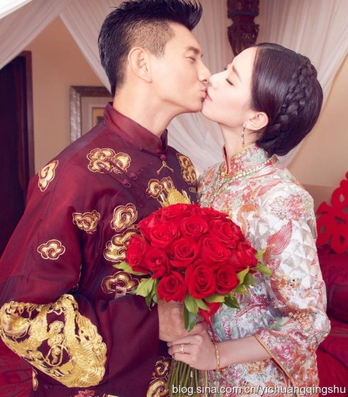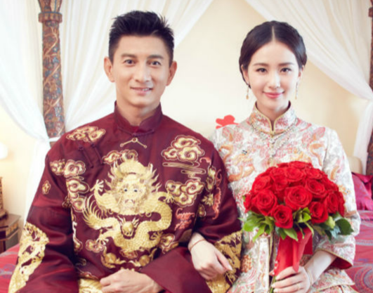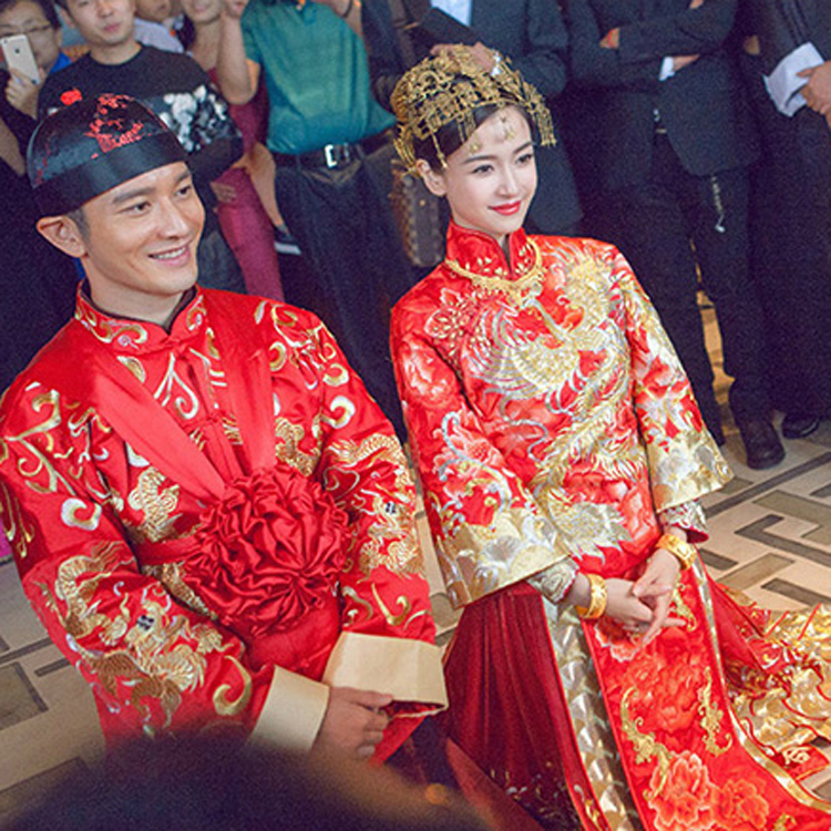 Angelababy的婚服也非常有代表性,紅色牡丹秀禾服,華麗禮服有黃色龍鳳刺繡,傳統的工藝現代的少量改良,耗工8000個工時,光刺繡就長達數月之久所做,再加上金色鳳冠非常華貴。