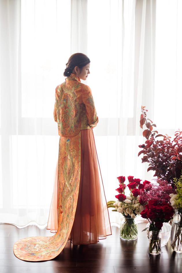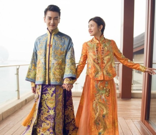 在北京婚宴上,陳妍希陳曉所穿橘黃色中式禮服分別耗時3985小時、1880小時,禮服上的瑞獸、龍紋刺繡,象征麒麟送子,富貴吉祥,出自郭培玫瑰坊高級定制。金繡鳳紋刺繡,非常精美華麗,又不會太落俗。