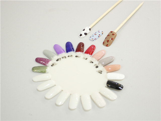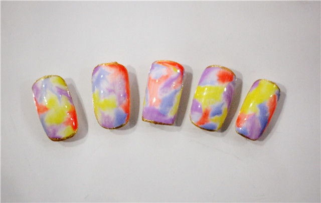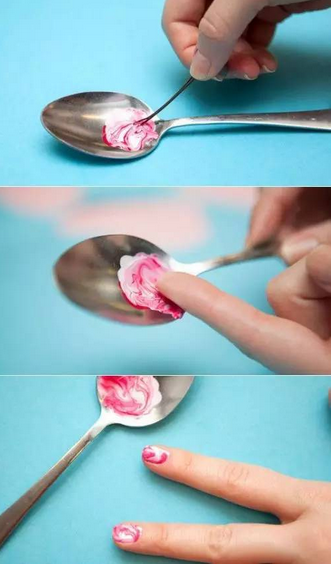 在上過(guò)護(hù)甲油后,將多色甲油滴入水中,用牙簽攪動(dòng)成你想呈現(xiàn)的效果,注意不要攪拌過(guò)度破環(huán)層次感;將手指貼近沾取,用工具輔助讓甲油層完全貼合;擦去多余處,封釉。