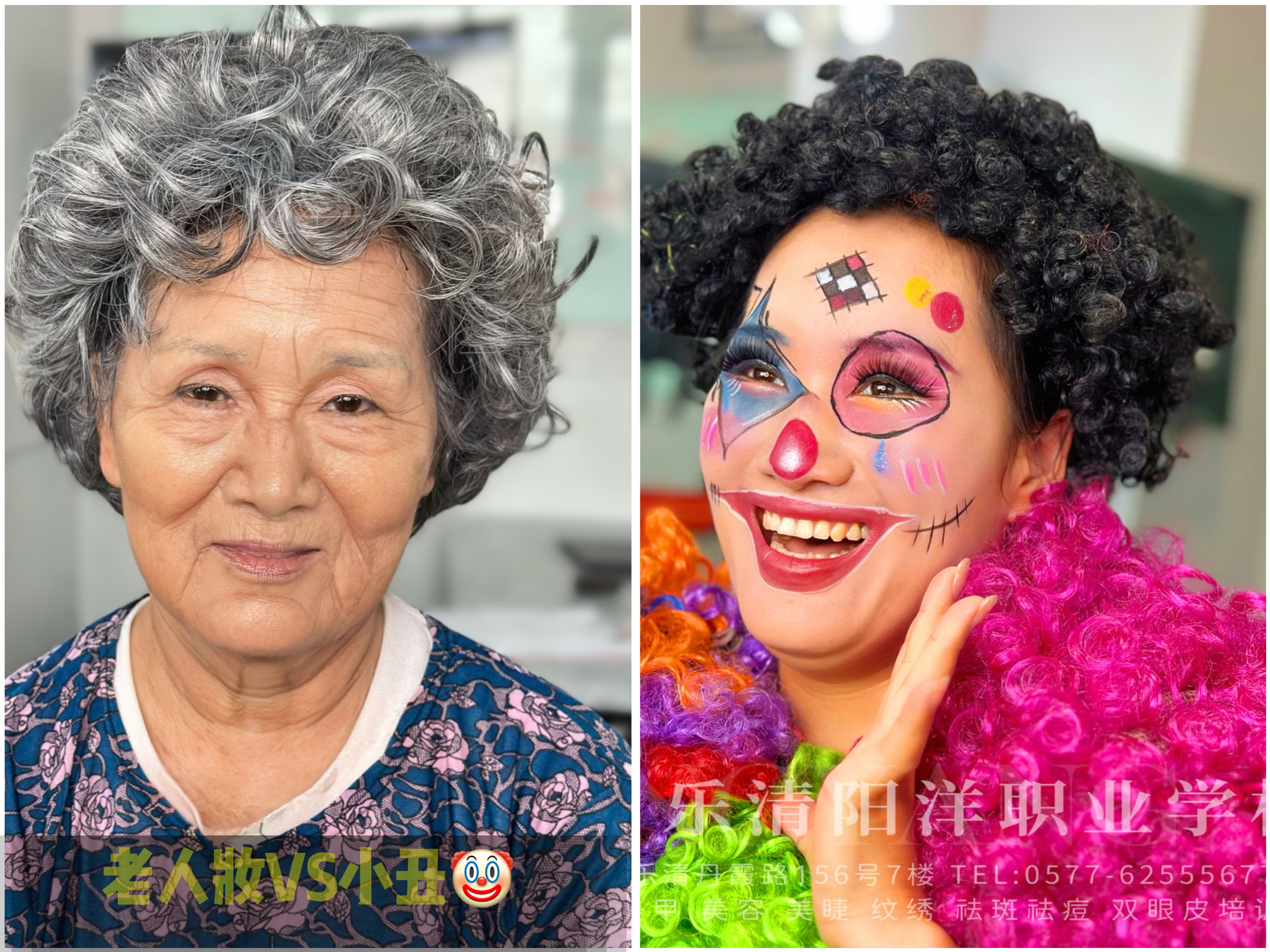 來自貴州27歲學員老年妝和小丑妝對比 以上是部分學員課堂練習作品、老年妝的皺紋代表代表歲月的痕跡、學習技能改變自己、珍惜年輕的自己 學化妝就來樂清陽洋職業(yè)技能培訓學校